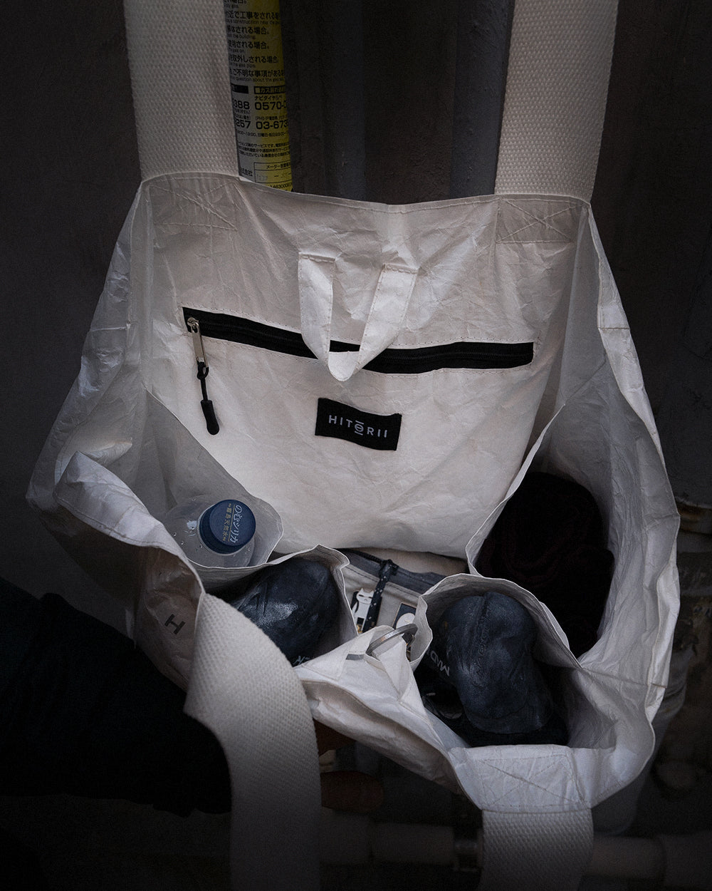 The Hitorii Tyvek Tote is our second iteration of the compartment tote, now made with Tyvek inspired by Qi's background as an architect.