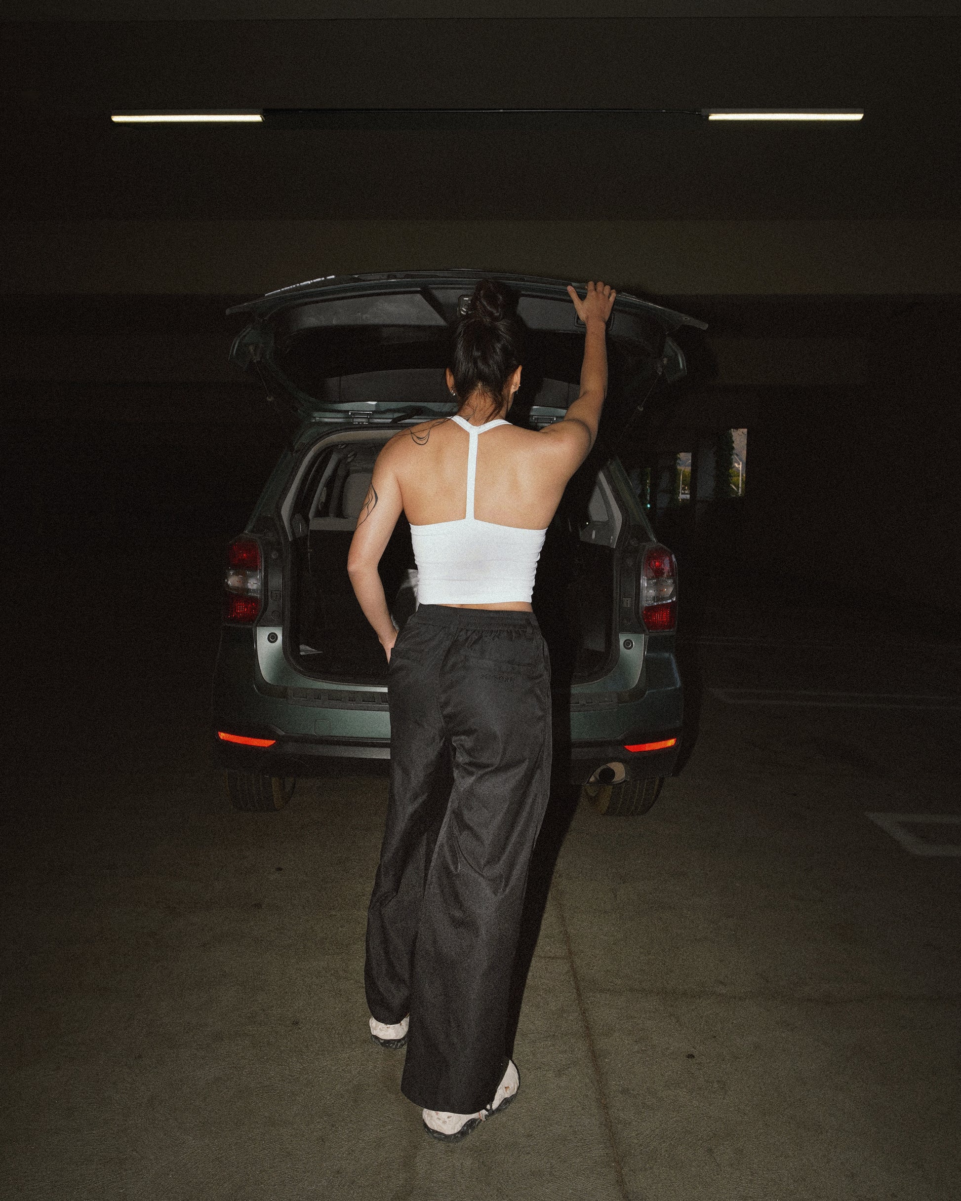 This is our “Cage to Crag” pants, specifically designed to be worn from the office to the climbing gym. These pants features our baggiest fit and work well with a loose top or a snatched tank.
